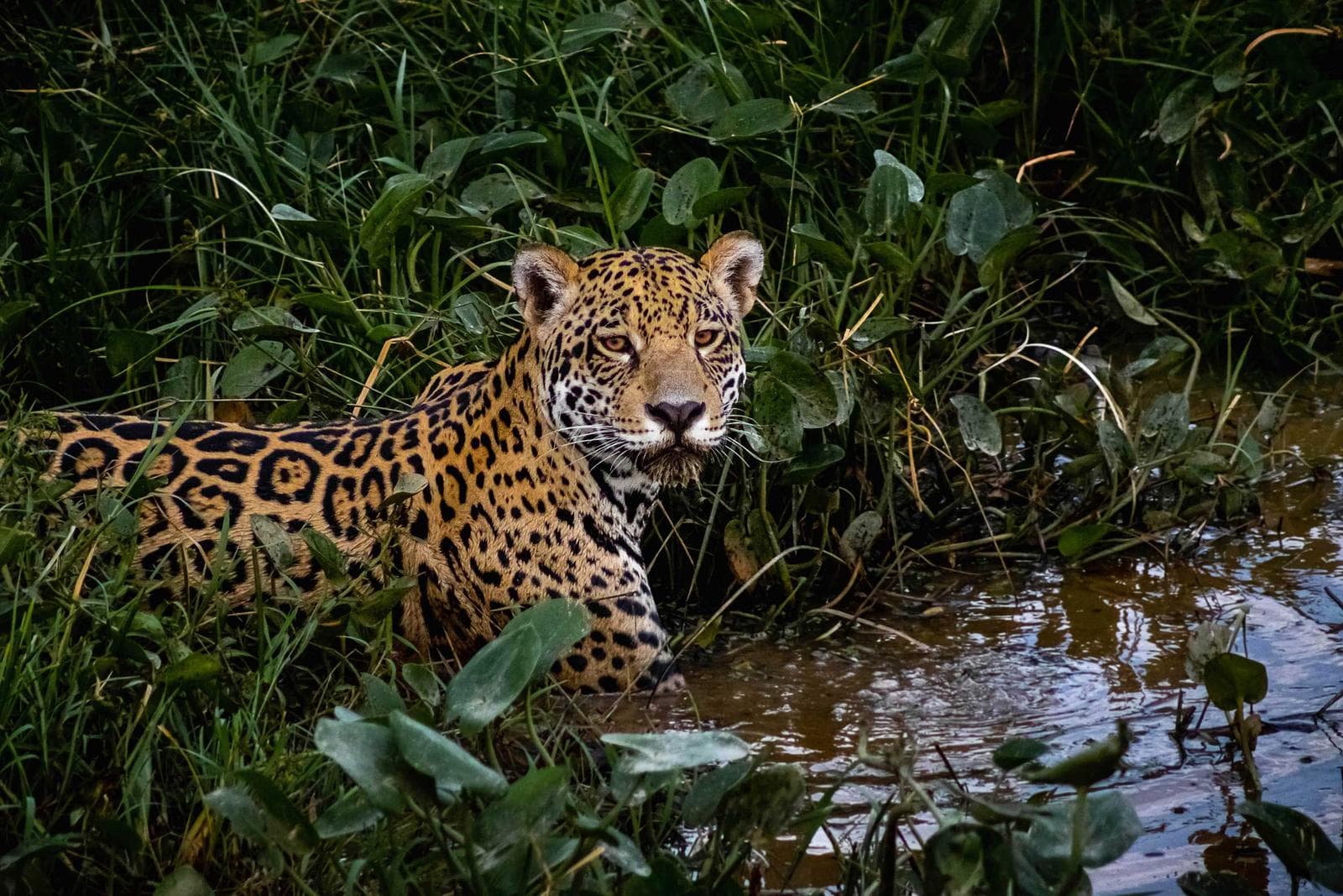 Amerikas største kattedyr og Pantanals uomtvistelige stjerne. Jaguarerne her er vant til både og kan ofte fotograferes på 15–30 meters afstand. Deres unikke vandjagt — at dykke efter kaimaner fra flodbredden — giver dramatiske billedsekvenser, som ikke findes nogen andre steder.